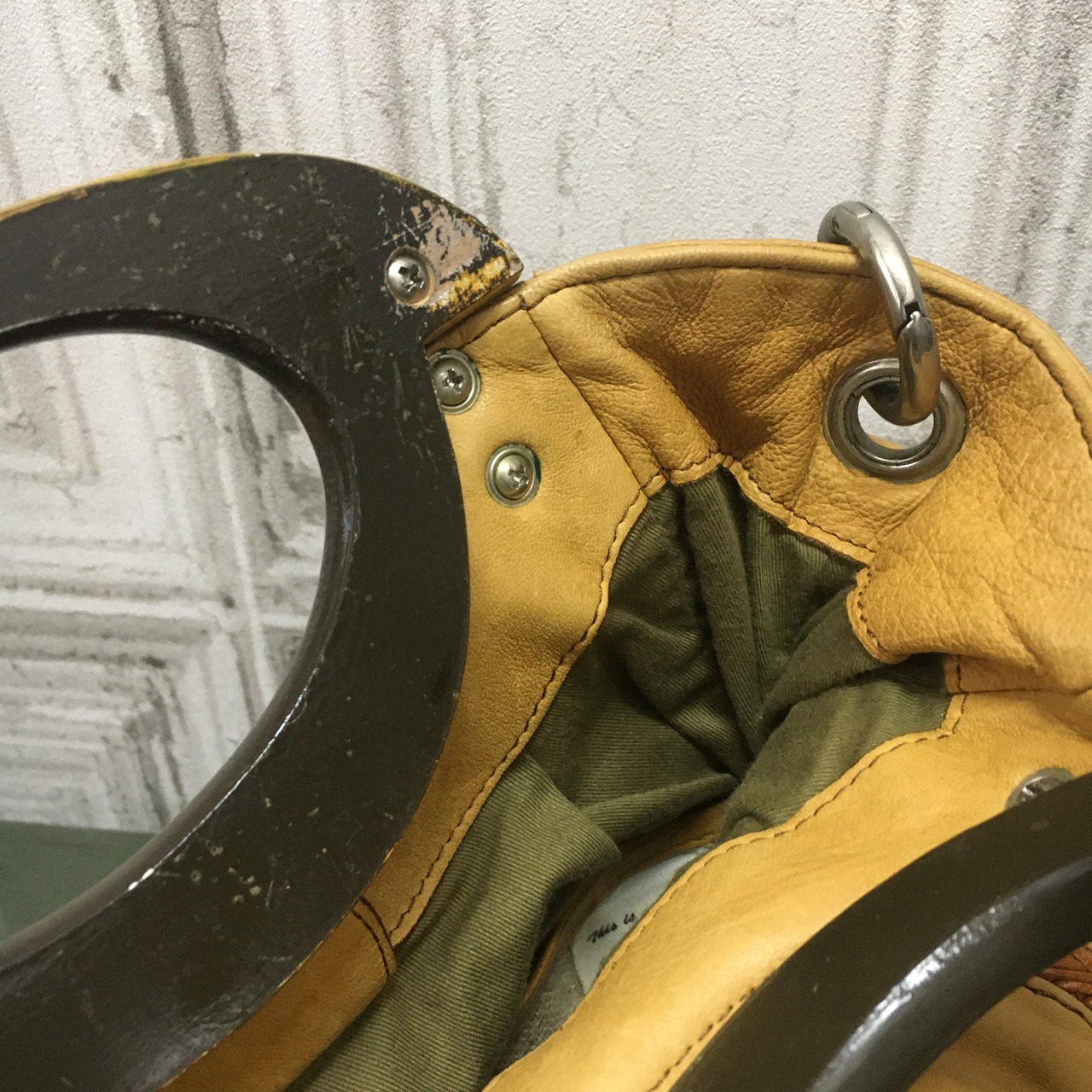 本体は柔らかい皮革で、持ち手はウッドだと思います。