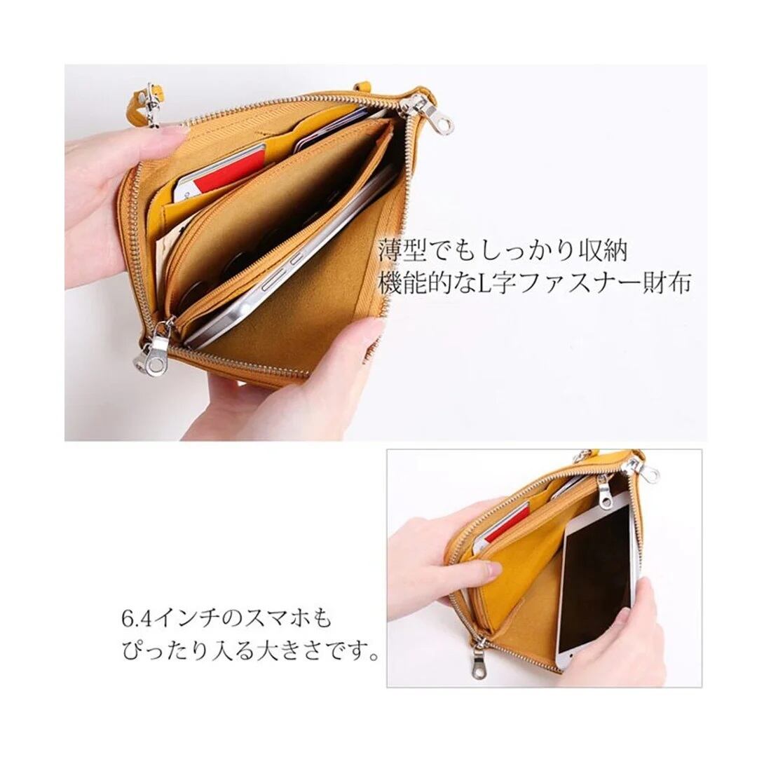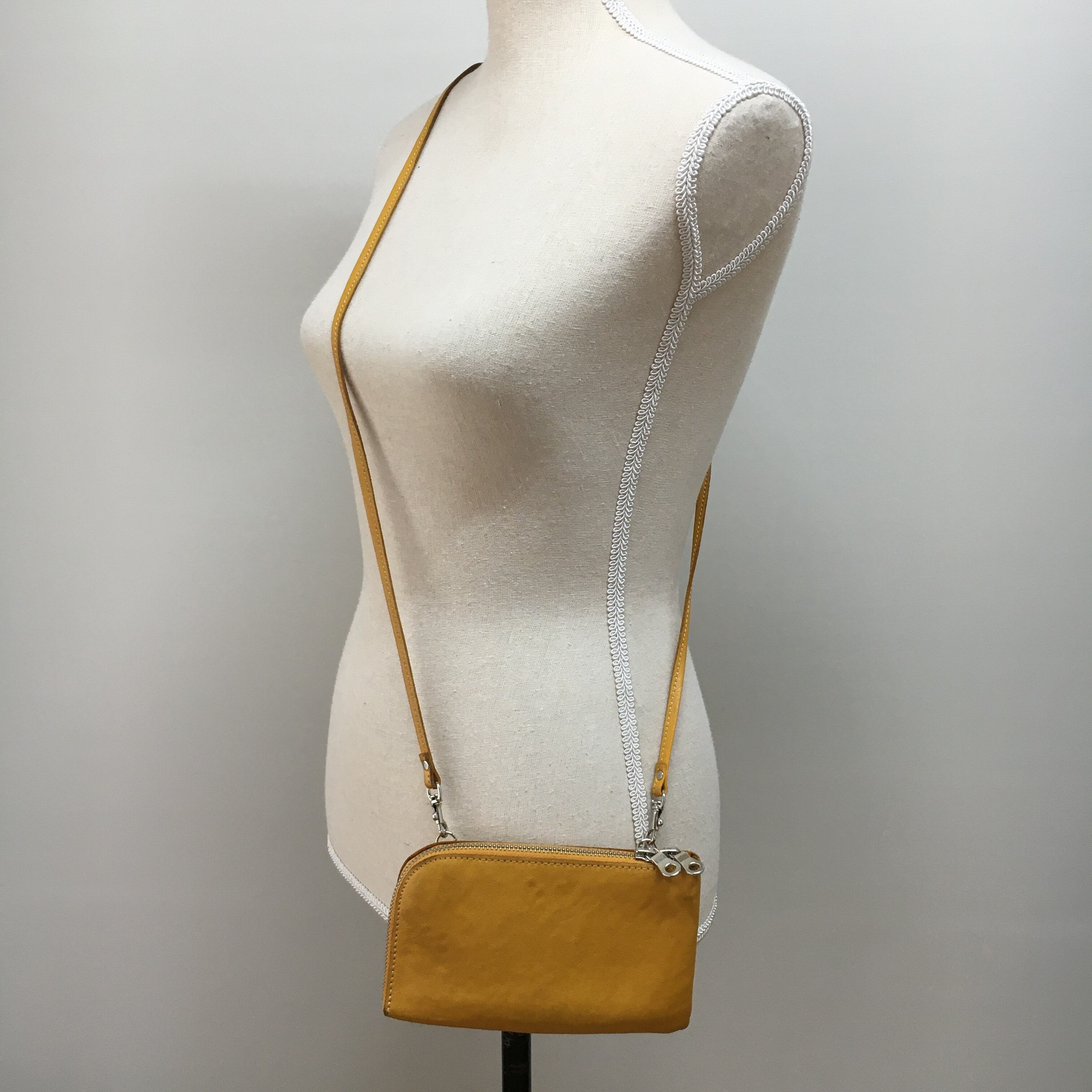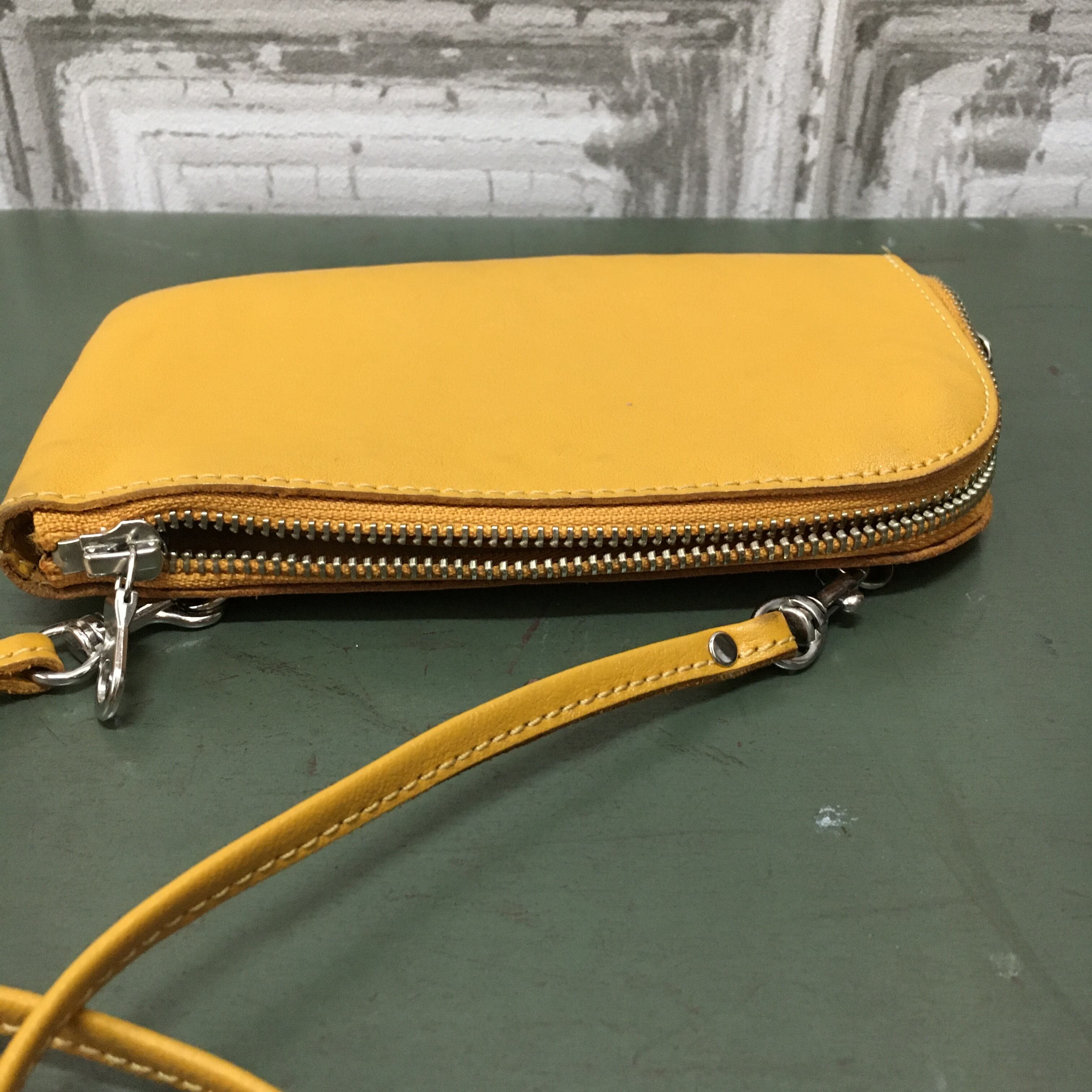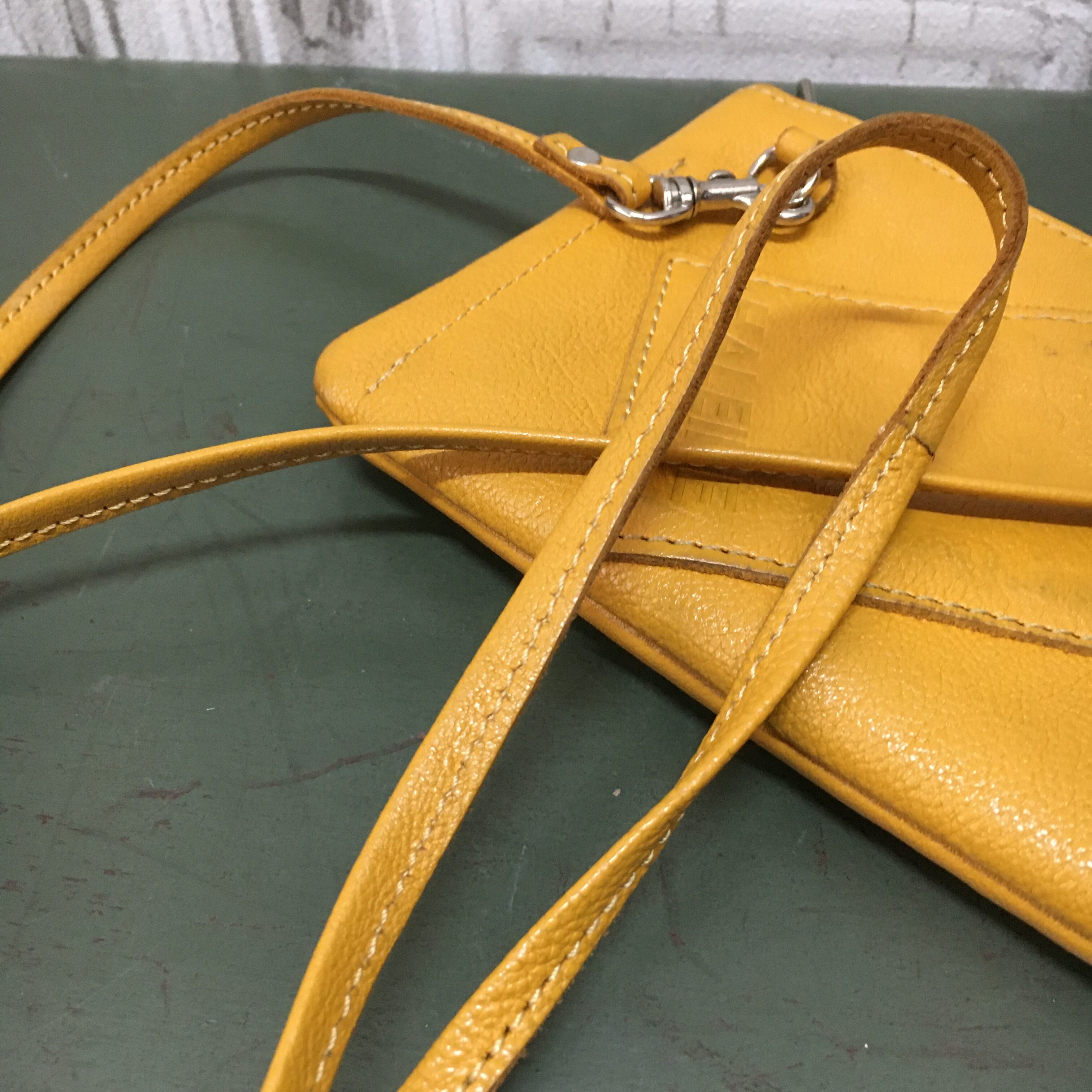 お財布ポシェットのカラーがマスタードです。