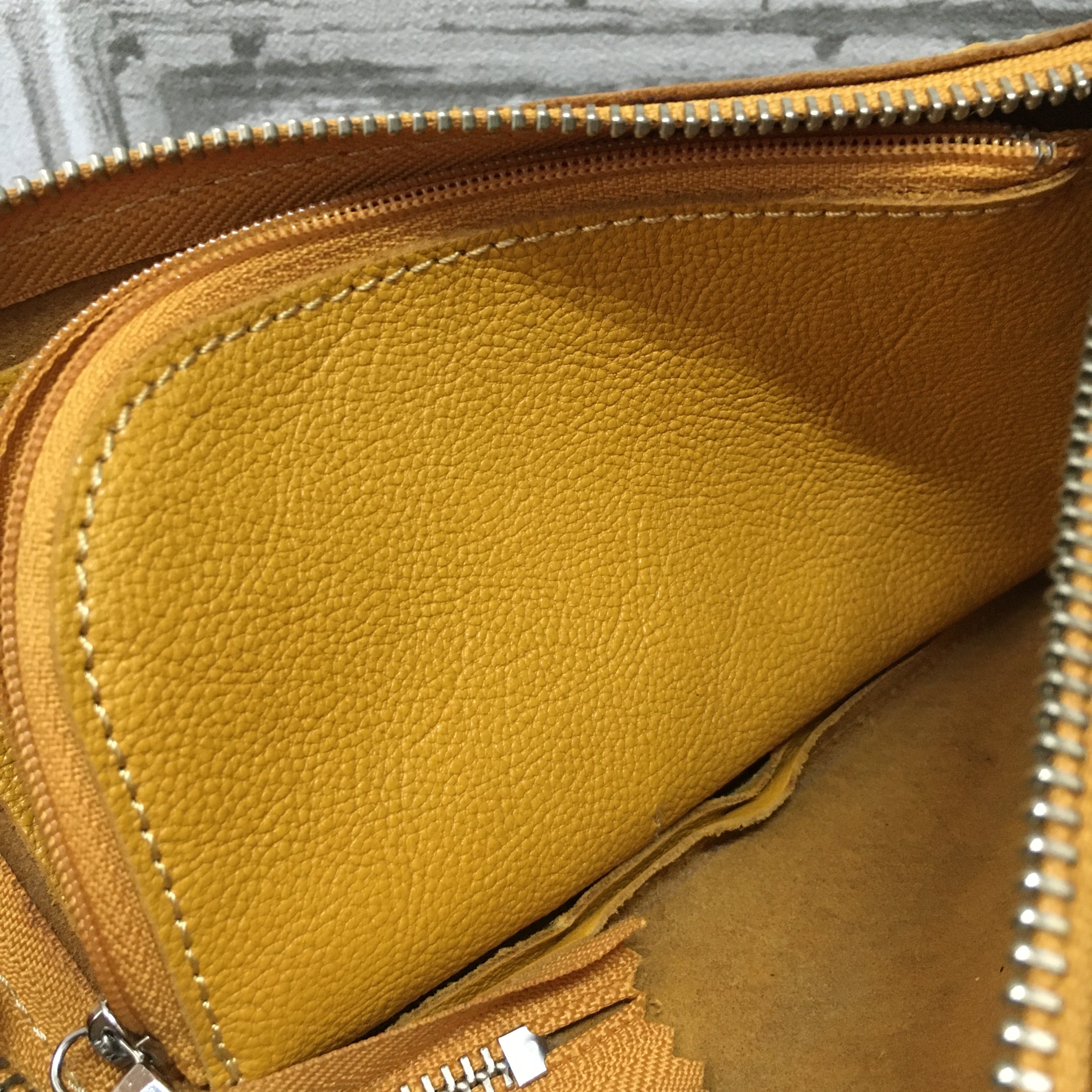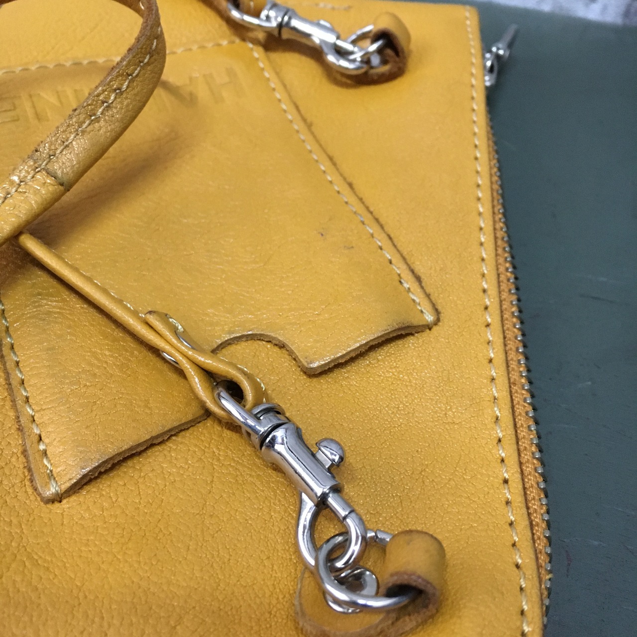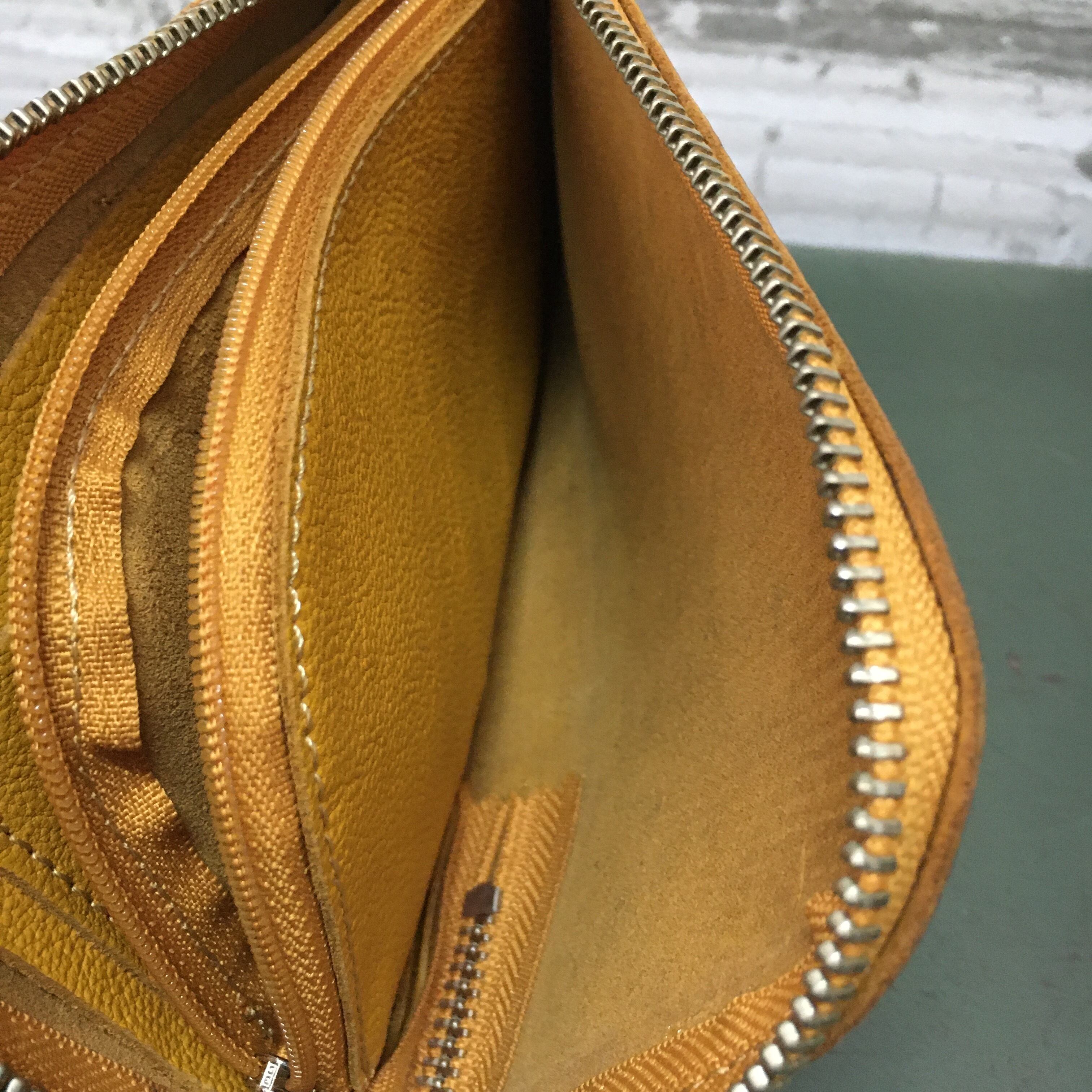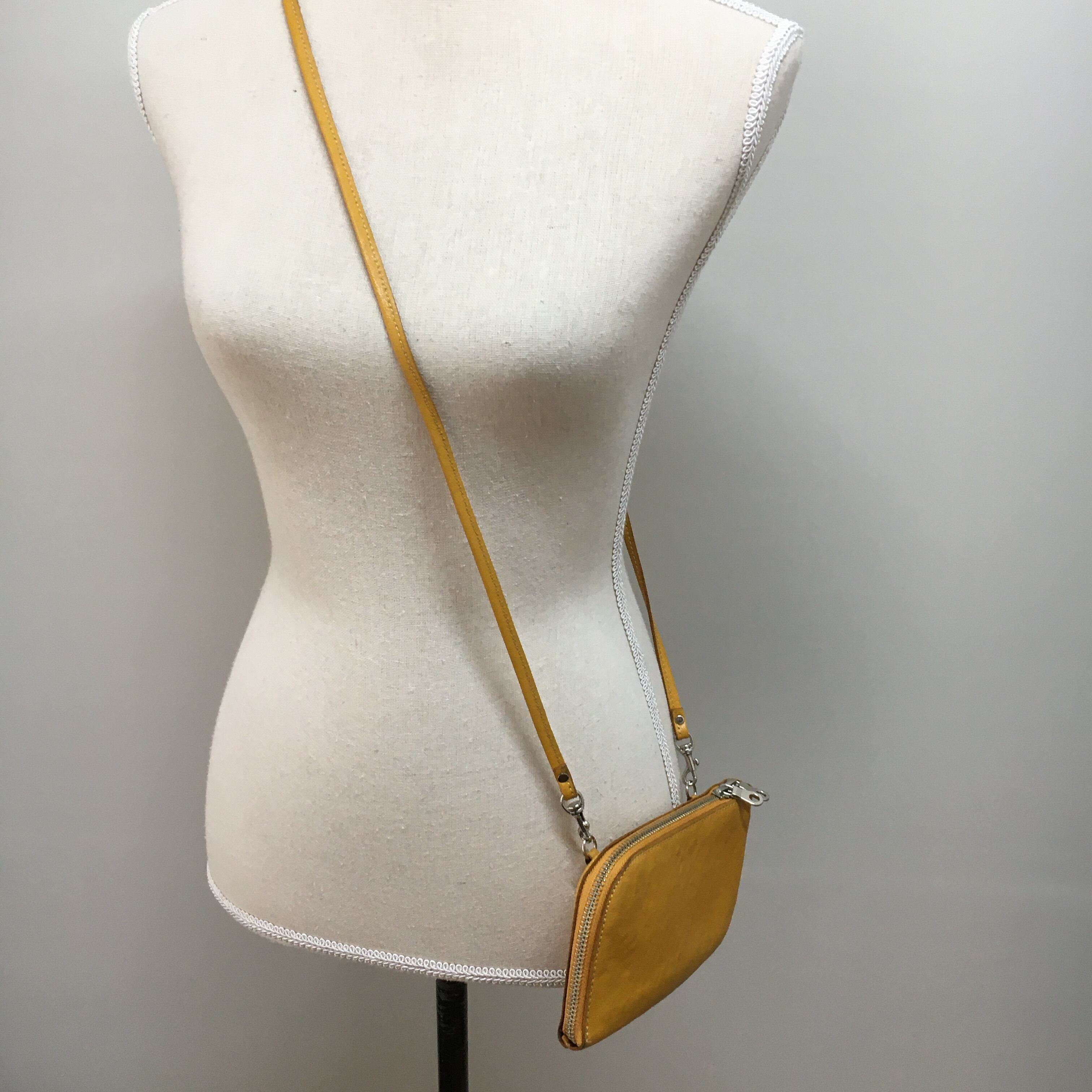 お財布ポシェットのカラーがマスタードです。
