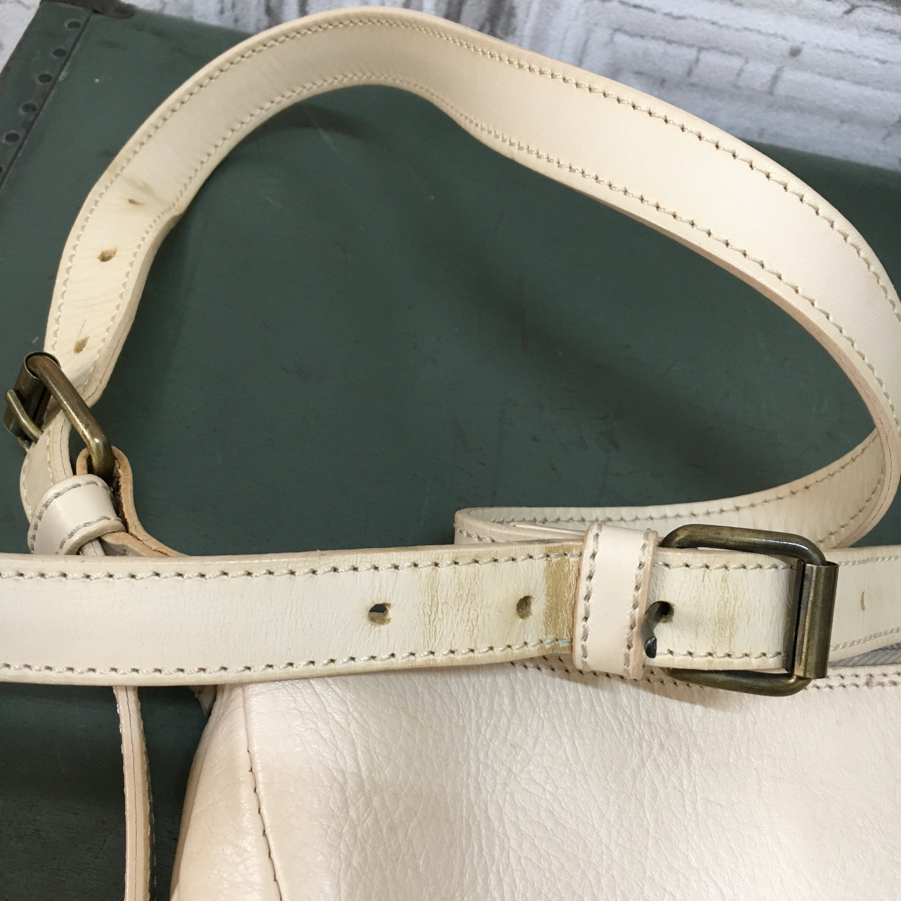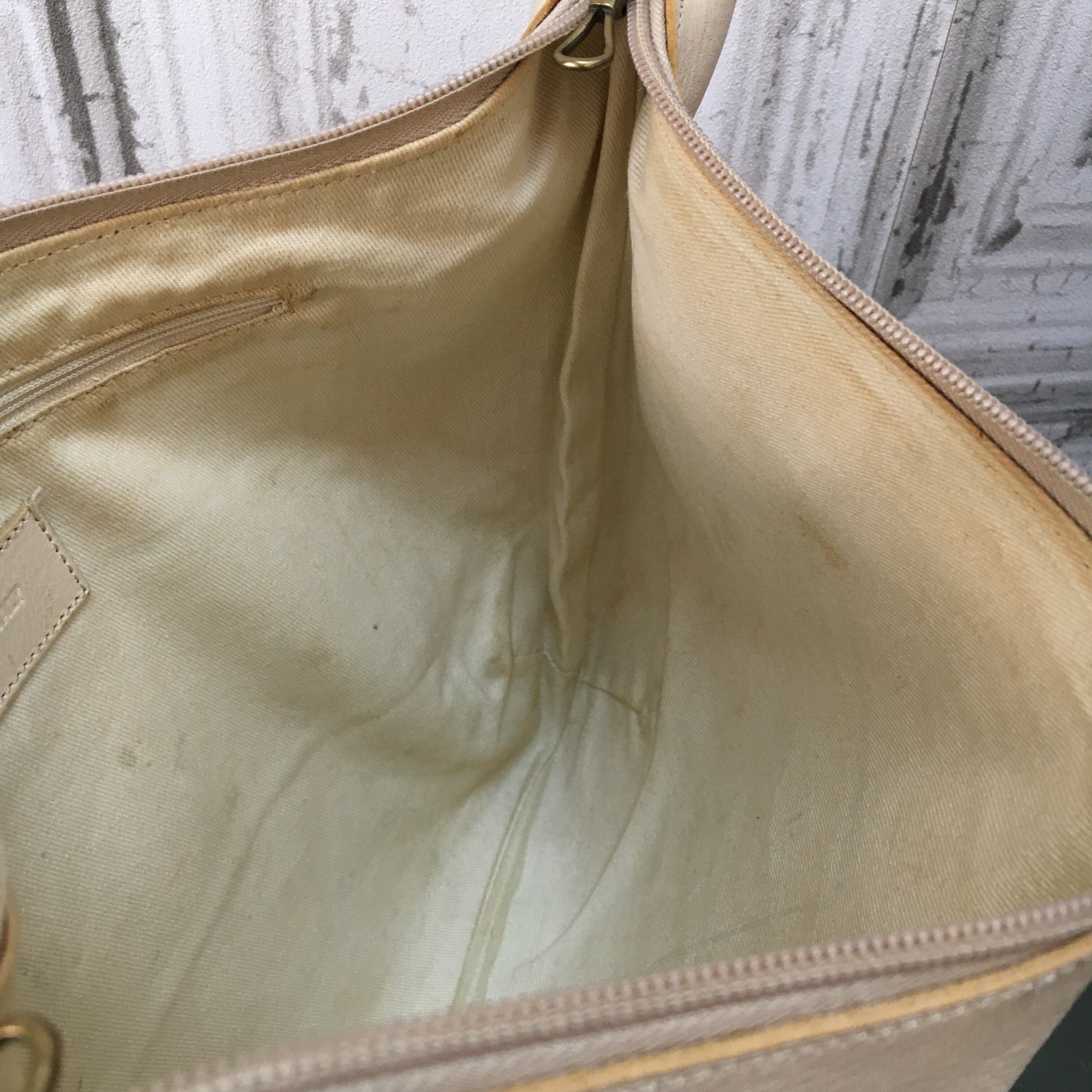 黒ずみ、色移り、裏地の汚れ、ストラップのキズがあります。
