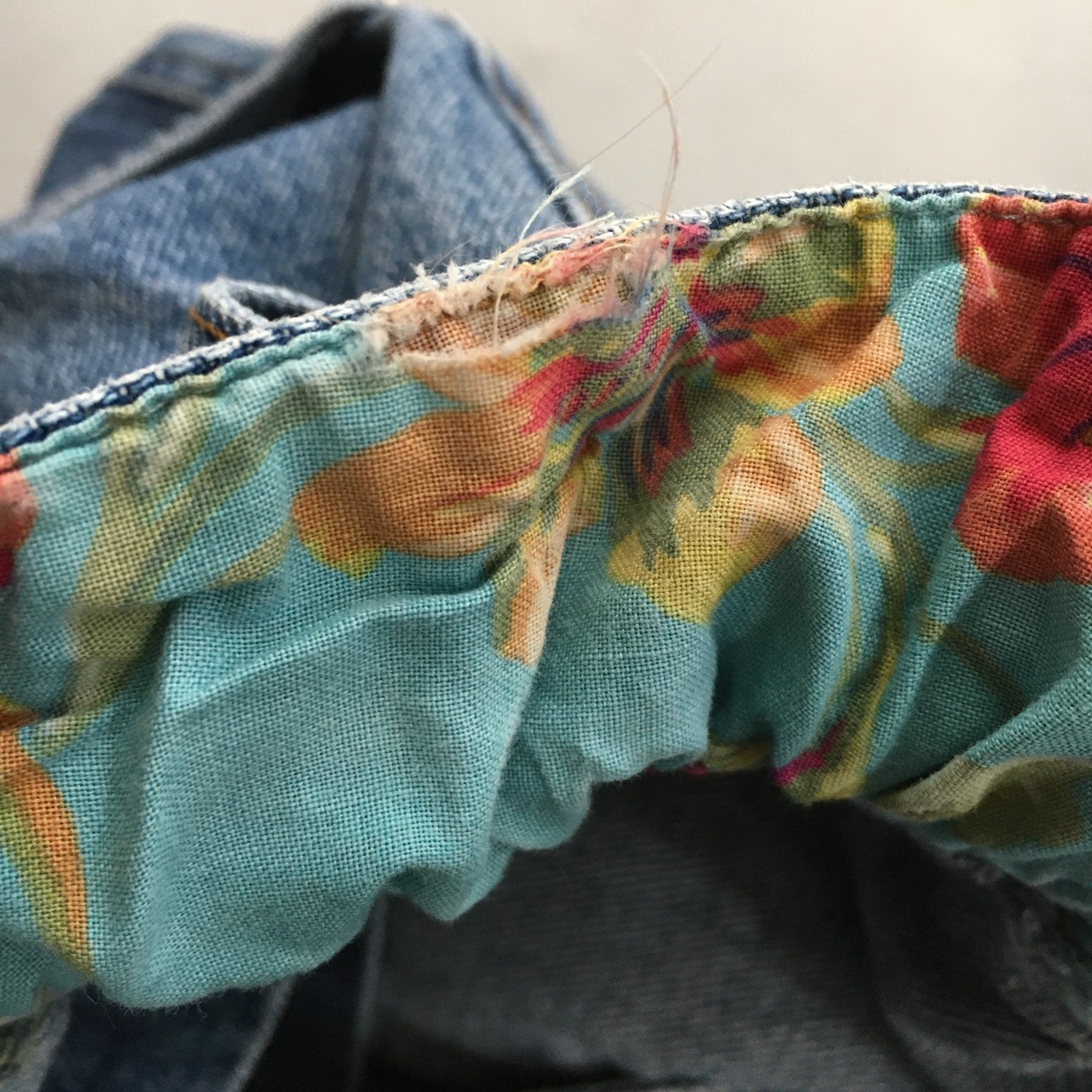 また、裏地の花柄部分の生地のダメージがあります。